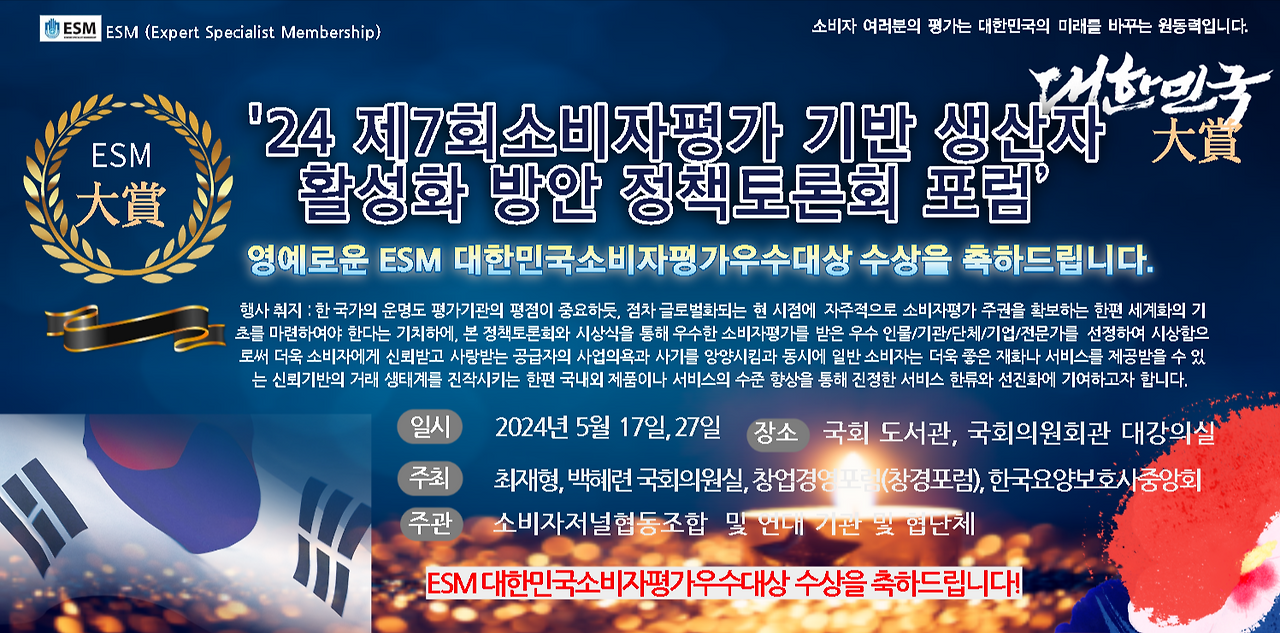 2. 다름이 아니라 그 동안 소비자평가를 통해 우수평가 기관(인물 등)에 대해 오는 2024년 5월 27일자 제7회 ESM 대한민국소비자평가우수대상 정책토론회 및 시상식 행사 개최에 앞서 아래와 같이 공지하오니 업무에 참조 바랍니다. (한 국가의 운명도 평가기관의 평점이 중요한 요즘, 대한민국 소비자평가 주권을 자주적으로 확보하는 한편 나아가 세계화에 참여해 주신 모든 기관 및 관계자 여러분께 감사드립니다.)
